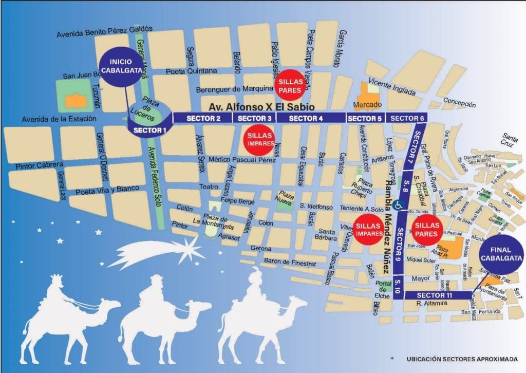 Seis mil personas podrán presenciar el desfile sentadas. Serán quienes pudieron adquirir las sillas disponibles en la venta on-line y en las taquillas de la plaza de toros y que se agotaron el mismo día en el que comenzó la venta. Éste será el recorrido: avenida de la Estación, plaza de los Luceros, avenida de Alfonso El Sabio, Rambla de Méndez Núñez y plaza del Ayuntamiento. En este punto, y sobre un escenario que se situará frente a la fachada principal de la Casa Consistorial, volverán a saludar a los pequeños antes de su despedida