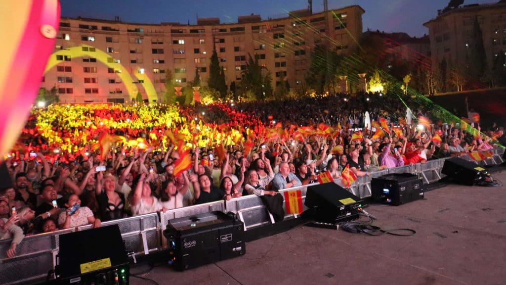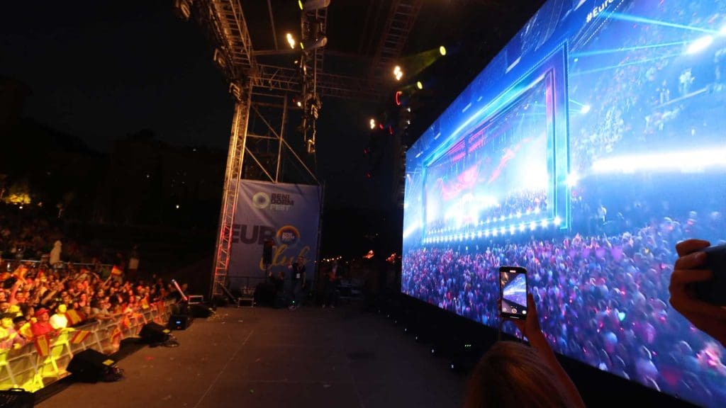 A las 21 horas, la gran pantalla instalada en el Parque de l’Aigüera conectó con RTVE que, a su vez, iniciaba la transmisión del certamen eurovisivo. Mientras tanto, nadie se movió del lugar a la espera de que Melody hiciera su aparición. Cuando llegó el momento, los miles de asistentes rompieron a aplaudir y a corear ‘Esa diva’ al mismo tiempo que la cantante sevillana deleitaba a los televidentes. La fiesta, no obstante, continuaba hasta el final de Eurovisión porque nadie quería perderse el resultado final. En otro lado de la ciudad, en la playa de Poniente, la también eurovisiva Chanel Terreros era la encargada de comunicar las puntuaciones de nuestro país.