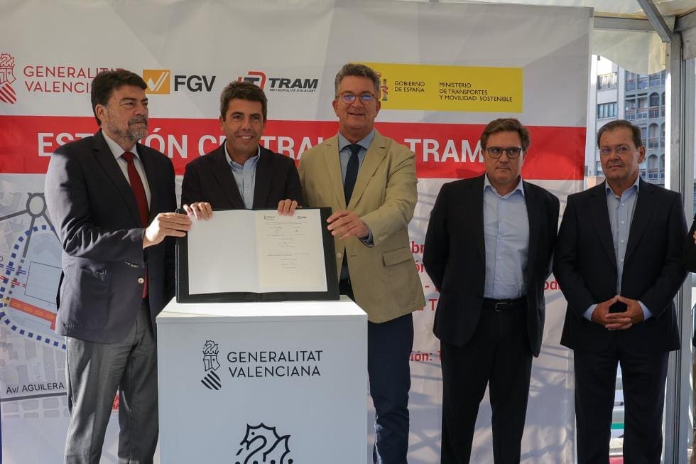 El president de la Generalitat, Carlos Mazón, ha firmado este viernes el acta de replanteo previa al arranque de los trabajos de edificación de la Estación Central del TRAM de Alicante, que será aledaña a la estación de Adif donde llegan los trenes AVE, Larga Distancia y Cercanías, y que incluye la conexión con los túneles que llegan desde la plaza de Luceros.