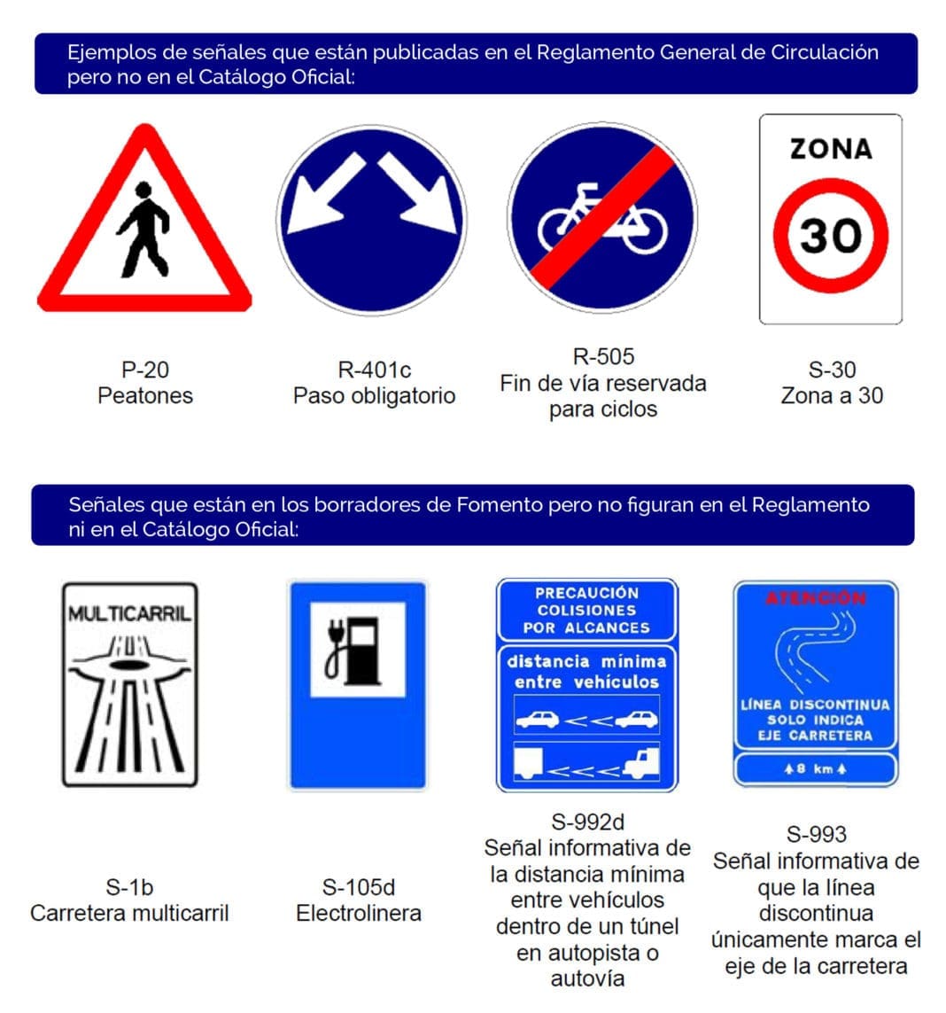 También está ocurriendo que hay señales que aparecen en borradores del Catálogo que Fomento ha ido actualizando en 2015 y en 2018. Su uso “puede ser finalmente un error, porque la señal puede modificarse de un borrador a otro, y de ellos a la versión que en un futuro se publique”.