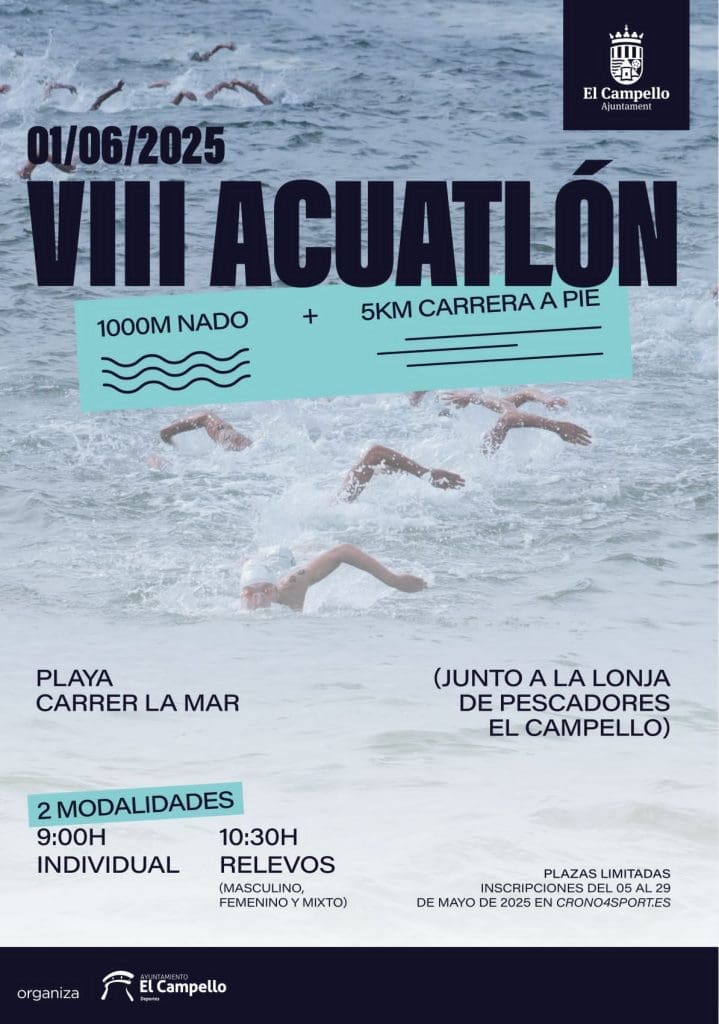 El 1 de junio, organizada por la concejalía de Deportes que dirige Marcos Martínez, se celebrará la octava edición del “Acuatlón El Campello”, que incluirá la modalidad individual (en la que una sola persona ha de nadar 1.000 metros y correr 5 kilómetros por el paseo marítimo de Carrer la Mar, y la modalidad por relevos (masculino, femenino y mixto), en la que dos personas cubrirán la prueba, de forma que una de ellas realizará el recorrido a nado, y la otra la carrera, con obligación de dar el relevo.