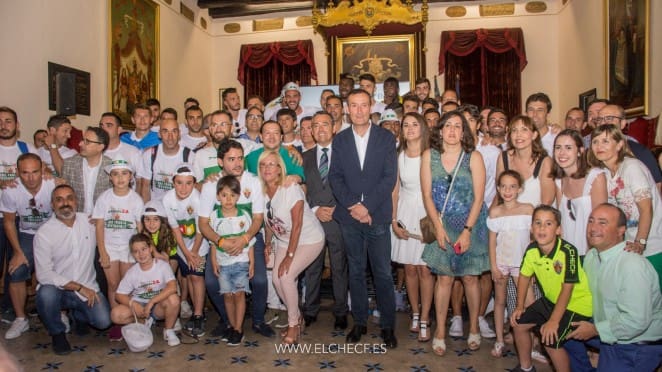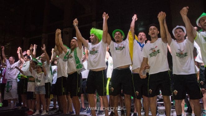 Y ayer fue el turno de la celebración oficial: rúa en autobús descapotable por las calles de la ciudad; recepción oficial en el Ayuntamiento de Elche junto al Alcalde y miembros de la Corporación Municipal; celebración por todo lo alto desde el balcón del Consistorio ilicitano con miles y miles de ilicitanos y franjiverdes en la Plaça de Baix; y ofrenda floral a la Patrona, la Virgen de la Asunción, en la Basílica de Santa María.