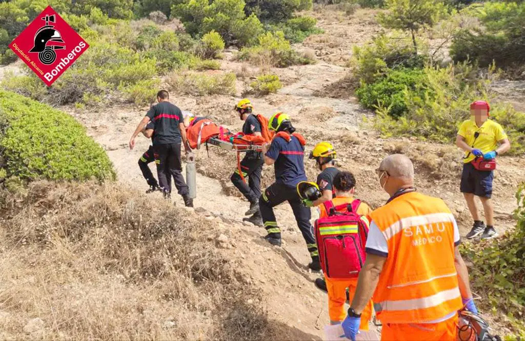 Es rescatada de la cala en camilla por lo escarpado del terreno y atendida por los socorristas y la ambulancia que la traslada a un centro sanitario.