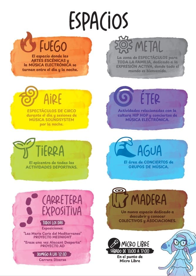Alacant Desperta dispondrá de siete escenarios: Fuego para artes escénicas de día y música electrónica de tarde y noche; Metal con una zona de espectáculos para toda la familia; Aire, con espectáculos de circo de día y sesiones de música soundsystem por la noche; Eter con actividades relacionadas con la cultura hip hop y la música electrónica; Tierra para todas las actividades y exhibiciones deportivas; Agua para conciertos de grupos musicales; y Madera, donde descubrir colectivos y asociaciones. A todo ello se suman dos exposiciones «Las Marie Curie del Mediterráneo”, Proyecto MedNight y «Érase una vez Alacant Desperta», proyecto AD.