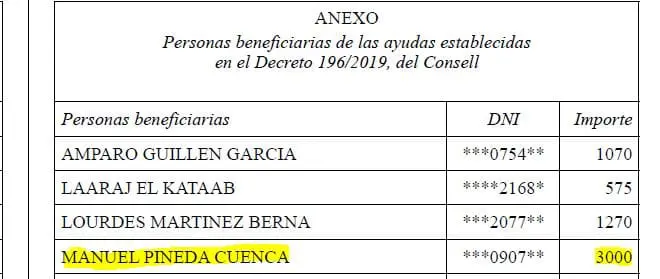 El alcalde de Rafal ha recibido un total de 3.000 euros que se añaden a los 1500 que ya recibió en la primera partida por estas ayudas, las máximas de su lote, sumando así un total de 4.500 euros en ayudas recibidas personalmente del Consell. Cabe recordar que Pineda también ejerce como diputado en Corts Valencianes desde junio de 2019.