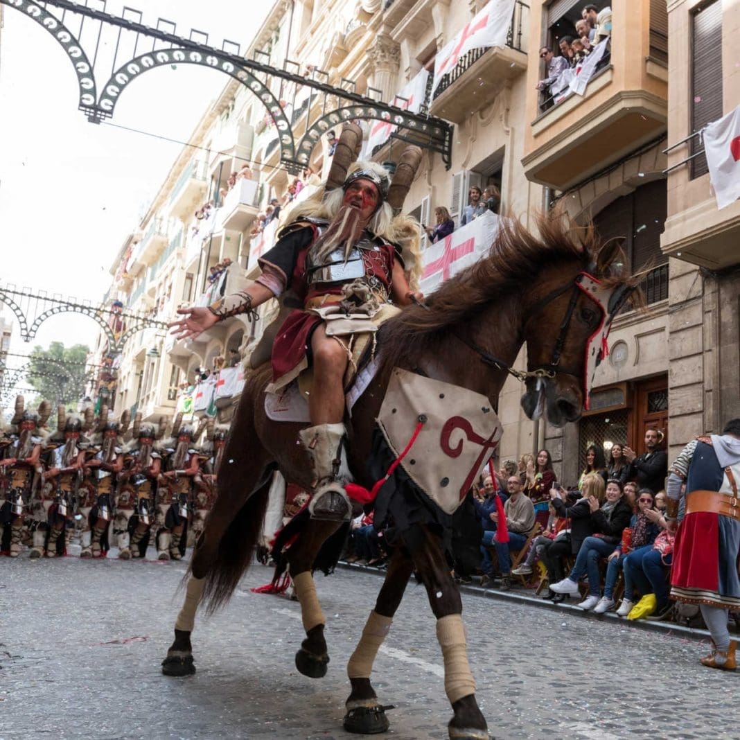 Durante la mañana es el turno del despliegue cristiano por las calles más céntricas del casco urbano de la ciudad, mientras que la tarde anochece con el majestuoso andar de las tropas mahometanas.