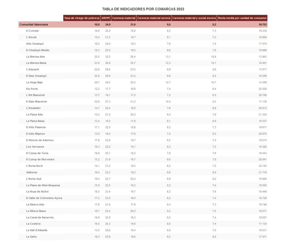 El estudio también analiza el indicador AROPE, que mide el riesgo de pobreza o exclusión social considerando tres factores clave: ingresos bajos, carencias materiales y sociales severas, y baja intensidad en el empleo. En este ámbito, L’Alcoià se sitúa con un 21,5%, una cifra que vuelve a ser inferior a la media autonómica, establecida en el 24,9%, y que refleja una situación más favorable que la de otras comarcas como la Vega Baja, que alcanza un preocupante 34,5%, o la Marina Alta, con un 32,5%.