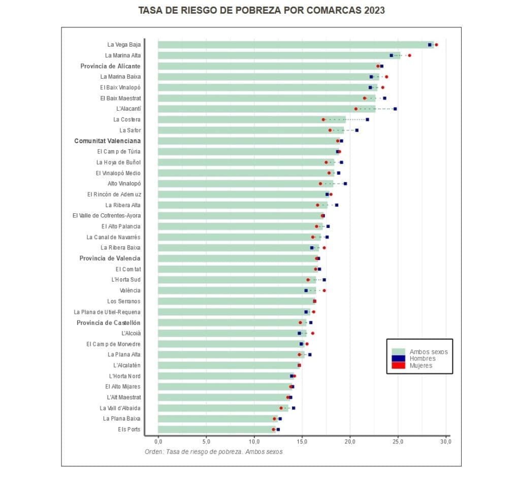Alcoy y su comarca, L’Alcoià, se consolidan como la zona con menor tasa de pobreza de la provincia de Alicante, según el último informe de la Generalitat Valenciana. Con un 15,4%, la comarca se sitúa por debajo de la media autonómica, que alcanza el 18,9%, y destaca como una de las áreas con mejores indicadores de bienestar social, seguida por El Comtat, con un 16,6%, y el Alto Vinalopó, con un 18,2%. En el extremo opuesto, la Vega Baja registra el índice más elevado, con un 28,7%, seguida de la Marina Alta, con un 25,2%, y la Marina Baixa, con un 23%.
