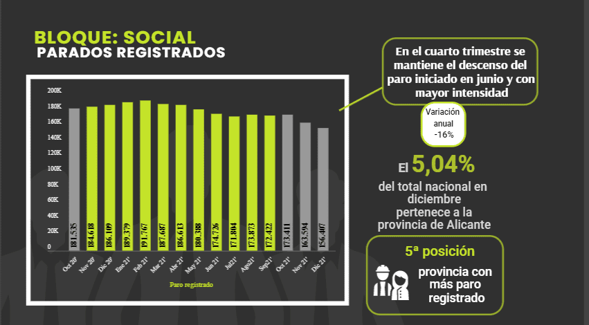Por su parte, Quino Palací ha recordado que “la provincia de Alicante cerró el año dando muestras de una leve mejoría pero esta situación nos ha hecho volver a cifras de finales de 2017 o, principios de 2018, en el mejor de los casos”. Palací ha puntualizado que “la provincia registró 1.790 empresas más que hace un año inscritas en la Seguridad Social, las cuales contabilizan 29.925 trabajadores adicionales. Un buen dato si no fuera por el incremento en la disolución de empresas y por el elevado índice de desempleo, que no consigue situarse aún en los niveles de 2019 en la provincia, a pesar de que en el conjunto nacional estas cifras se han mejorado sensiblemente”.