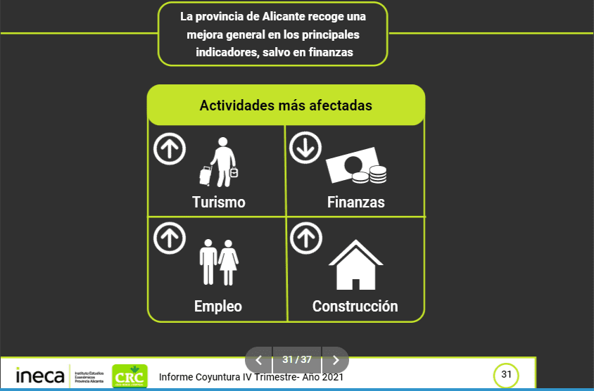 La recuperación de Alicante está sucediendo más despacio y «con menor empuje» que en el panorama nacional. El Instituto de Estudios Económicos de la Provincia de Alicante (INECA) ha dado a conocer el Informe de Coyuntura Socioeconómica de la provincia correspondiente al cuarto trimestre de 2021 así como el balance de 2021. Los resultados apuntan a una recuperación incompleta que sitúa al tejido productivo de nuestra provincia a la cola en cuanto a recursos financieros y de crédito. Empresas valiosas y variadas señalan los analistas de esta entidad pero que sufren también una posición de desventaja frente a otros territorios por su alta tasa de paro y renta per cápita baja. Una situación «compleja» y con falta de inversores para la que animan a «seguir demandando un trato equitativo».