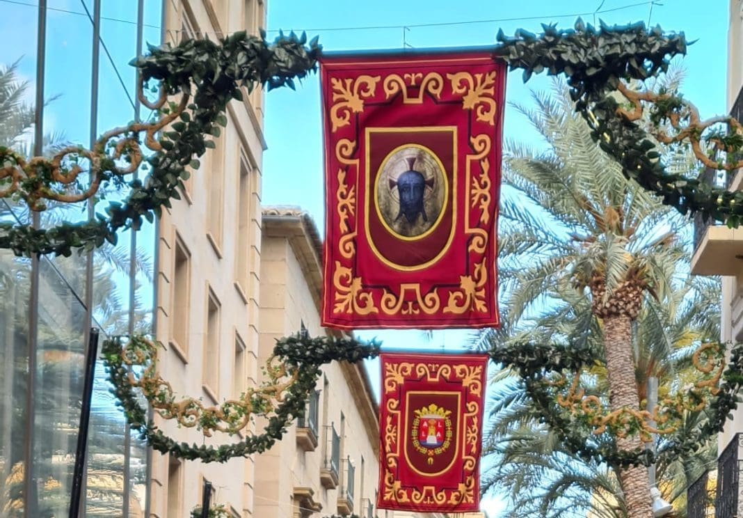 Este ornamento vegetal está hecho a base de hojas, yedra y margarita. Todo ello entrelazado sobre un tejido de rafia. En el centro están situados unos reposteros de color burdeos sobre los que destacan el escudo de Alicante y una imagen de la Santa Faz.