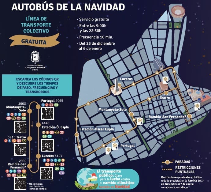 El autobús gratuito recorre de forma circular las principales arterias del centro tradicional con paradas en la Rambla, Alfonso el Sabio, Luceros, Estación-Óscar Esplá, calle Reyes Católicos, Calle Portugal, Federico Soto, Teatro y vuelve a la Rambla, para disfrutar de la iluminación, participar en las actividades programadas o realizar compras entre las 9 y las 22:30 horas, con una frecuencia de paso de 10 minutos.