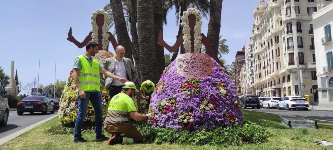 La plaza del Mar y la avenida de la Estación son los lugares elegidos para lucir estas figuras de más de tres metros de altura, que mantienen la iniciativa de colocar arreglos florales en planta viva para celebrar las efemérides de la ciudad, que se estrenaron la pasada Navidad, ofreciendo un salto de calidad y un nuevo atractivo paisajístico para Alicante.