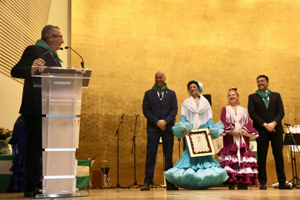 Barcala y Pérez han entregado a Leonor Jiménez, presidenta de la Casa de Andalucía en Benidorm, el título acreditativo como Andaluza del Año 2026, al tiempo que han tenido un reconocimiento a los representantes de las distintas casas y entidades andaluzas de la provincia presentes en el acto, presidentes, reinas, damas y rocieras, con el presidente de la Federación Cultural de Andalucía al Sur de la Comunidad Valenciana (FECUAS), Raúl González Melero, al frente. En el acto han participado también la concejala de Comercio de Alicante, Lidia López, y el diputado, José Ramón González de Zárate, además del concejal de Cultura de San Vicente, Óscar Llopis, entre otras autoridades presentes.