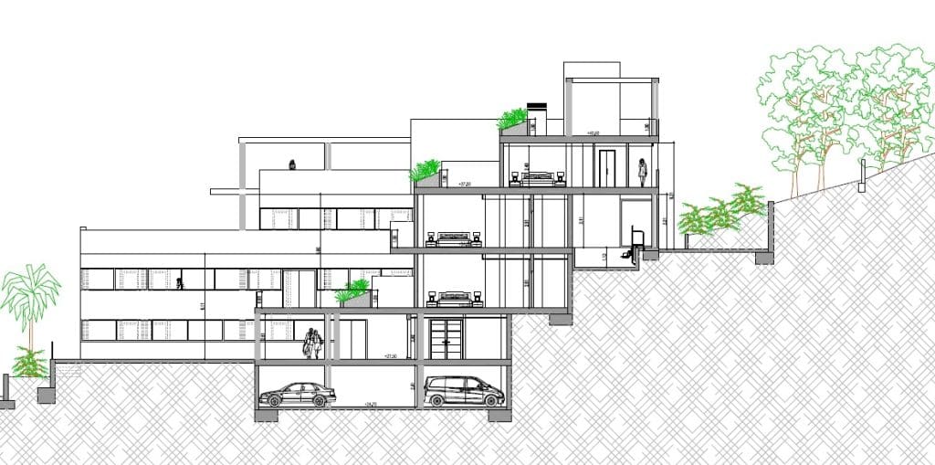 El edificio proyectado corresponde a la tipología de bloque abierto, con forma de «U» y sección escalonada, siguiendo la pendiente de la ladera sobre la que se asienta, orientando sus vistas hacia la playa de La Albufereta por su frente y hacia la Serra Grossa por su parte trasera.