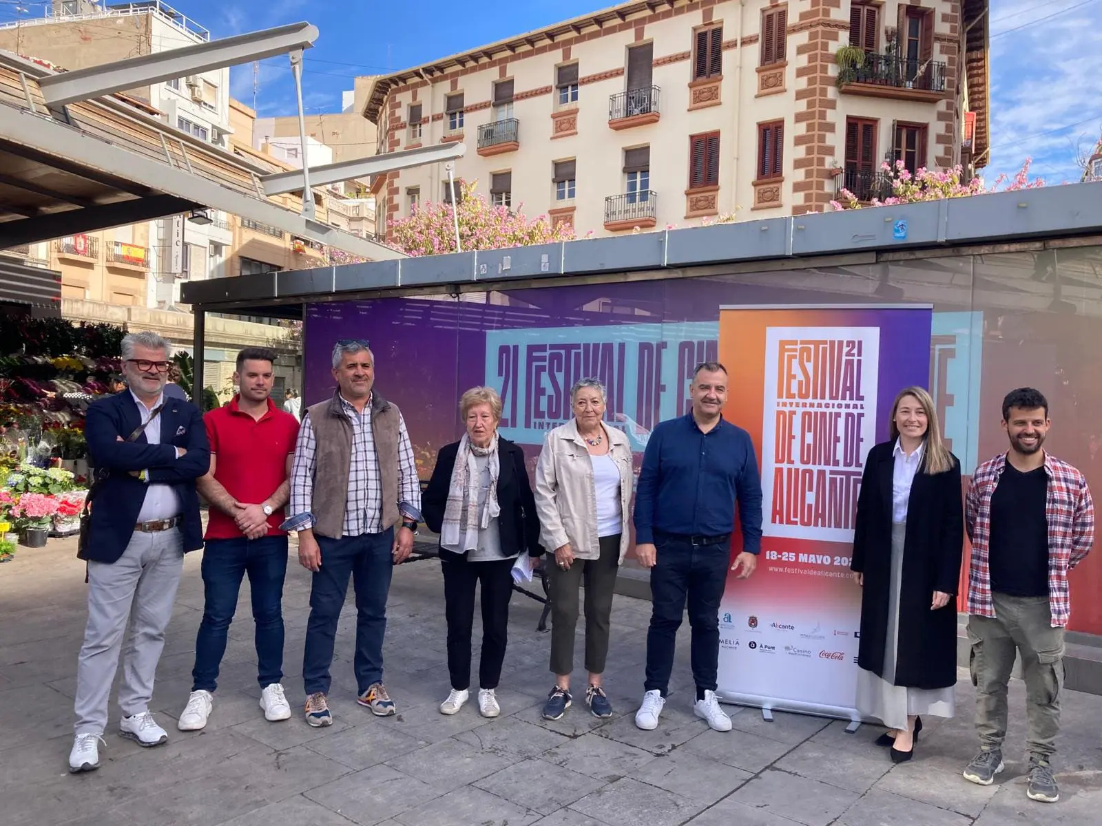La concejala de Comercio, Consumo y Mercados, Lidia López, ha presentado las dos iniciativas este miércoles en el Mercado Central junto con el director del Festival Internacional de Cine de Alicante, Vicente Seva, el presidente de la asociación de Mercados Municipales y los presidentes de asociaciones de comerciantes del centro y los barrios.