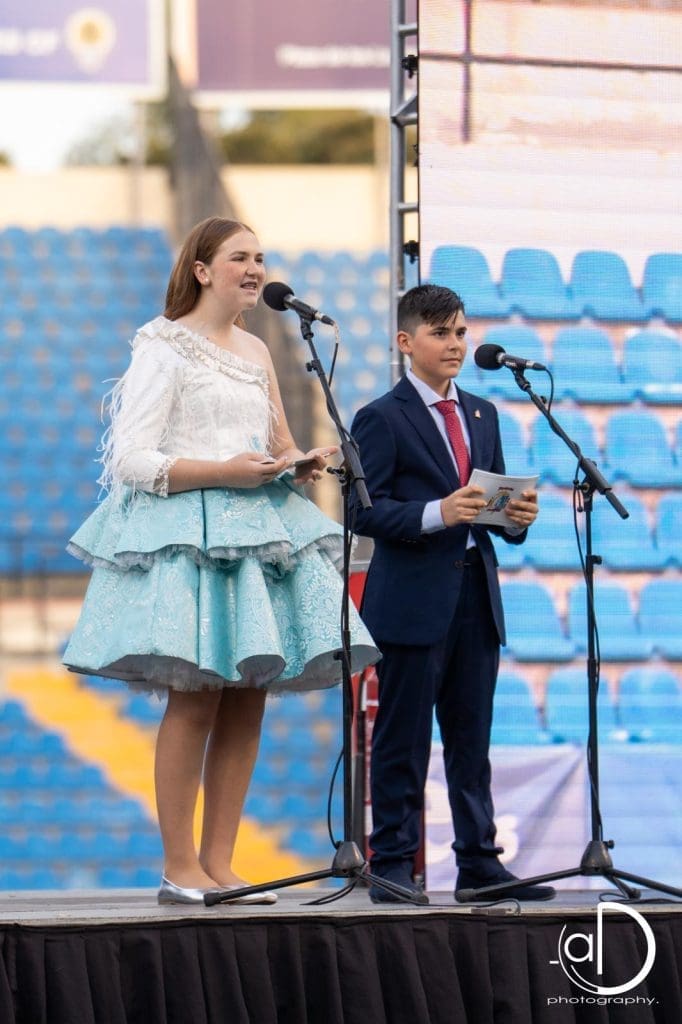 El viernes, la Gala de Candidatas Infantil abrió el camino para la noche del sábado se convierte en una auténtica celebración. Pasadas las 19:00 horas, las jóvenes candidatas a Belle del Foc comenzaron a sentir el calor de Alicante. Durante el evento, Selene Gaitán Navarro, de la Foguera L’Harmonia San Gabriel, y Abel Orts Recio, de la Foguera Altozano Sur, condujeron la gala con solvencia y cercanía.