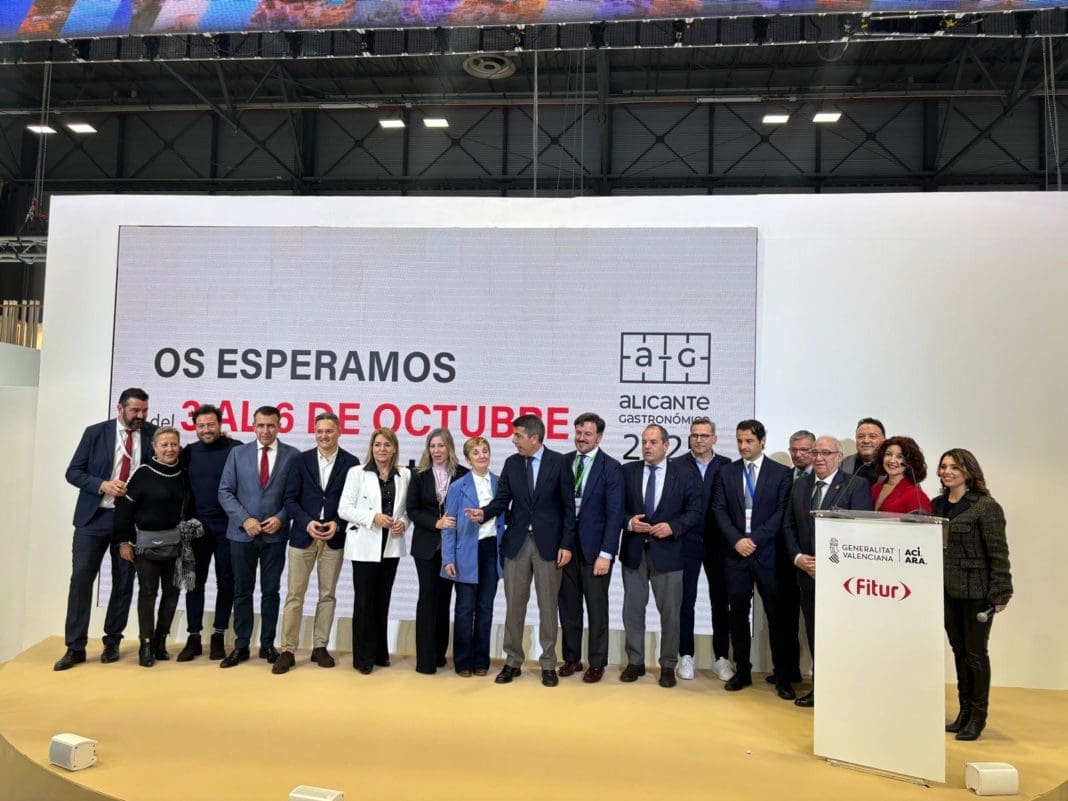 El presidente de la Cámara de Comercio de Alicante, Carlos Baño, la presidenta de Alicante Gastronómica, Gema Amor, y el director general de IFA-Fira Alacant, Alejandro Morant, han presentado esta semana, en la Plaza Central del stand de la Comunitat Valenciana en Fitur, la séptima edición de Alicante Gastronómica 2025, el mayor ferial experiencia de España y que el pasado año batió todos los récords con la asistencia de más de 78.000 visitantes. El certamen se ha presentado junto a la feria Gastrónoma de Valencia y ha contado con la participación del president de la Generalitat Valenciana, Carlos Mazón, quien ha destacado “la ‘germanor’ entre ambos eventos, siendo los mejores escaparates para nuestra gastronomía”.