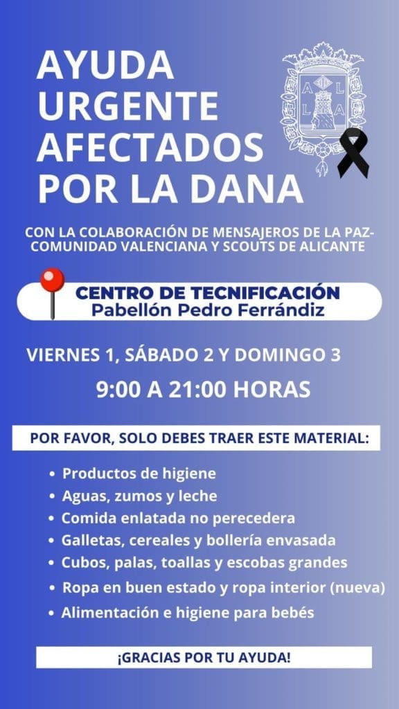 El material a distribuir entre las víctimas debe ser: productos de higiene; aguas, zumos y leche; comida enlatada no perecedera; galletas, cereales y bollería envasada; cubos, palas, toallas y escobas grandes; ropa en buen estado y ropa interior (nueva) y alimentación e higiene para bebés. “Es muy importante que la aportación se ajuste estrictamente a estos artículos y productos de primera necesidad para que la ayuda sea verdaderamente eficaz”, ha destacado el alcalde Luis Barcala, que ha hecho una llamada a la “acreditada solidaridad de los alicantinos” para que los ciudadanos participen en esta iniciativa de emergencia.