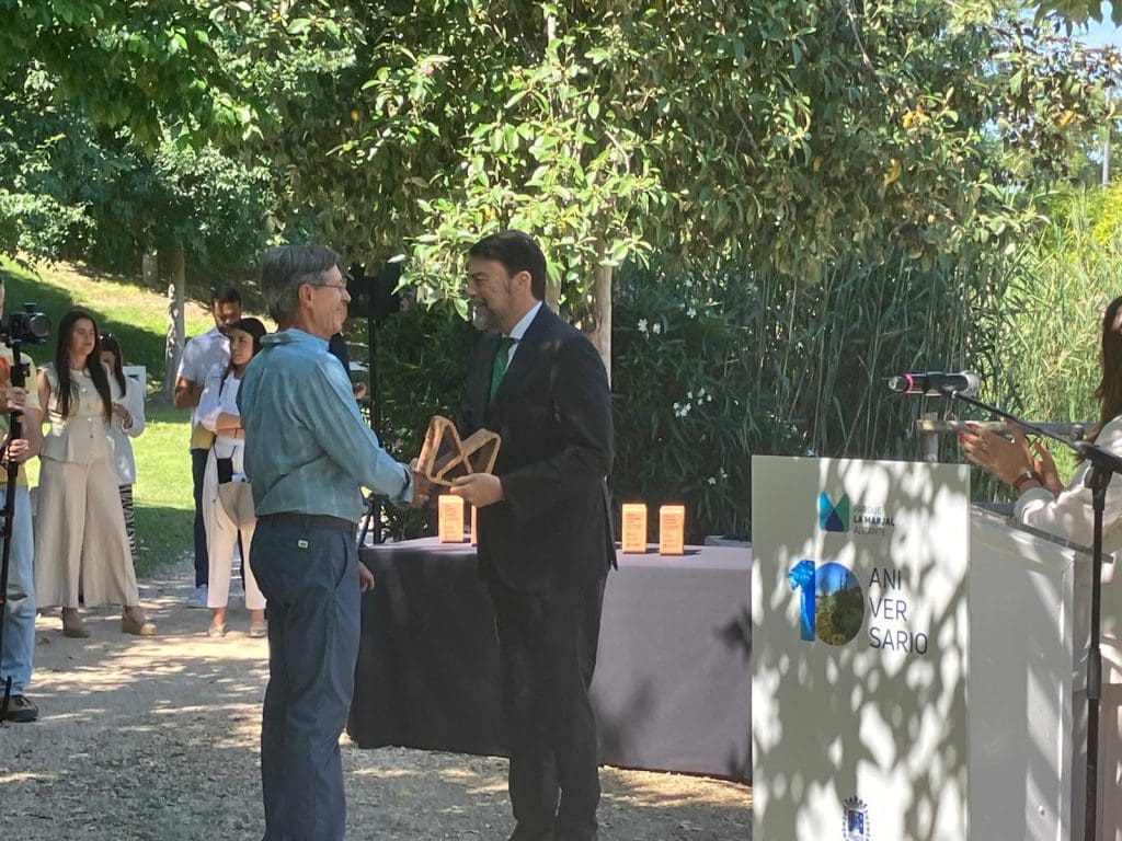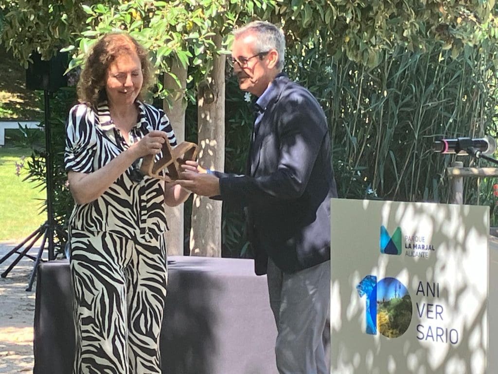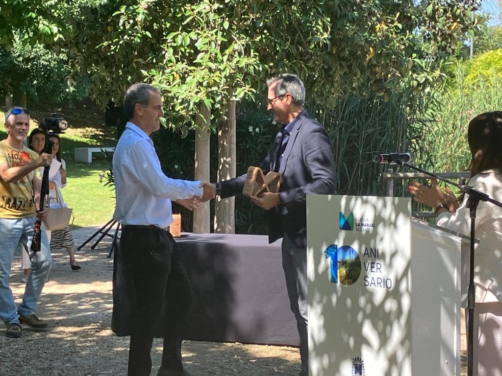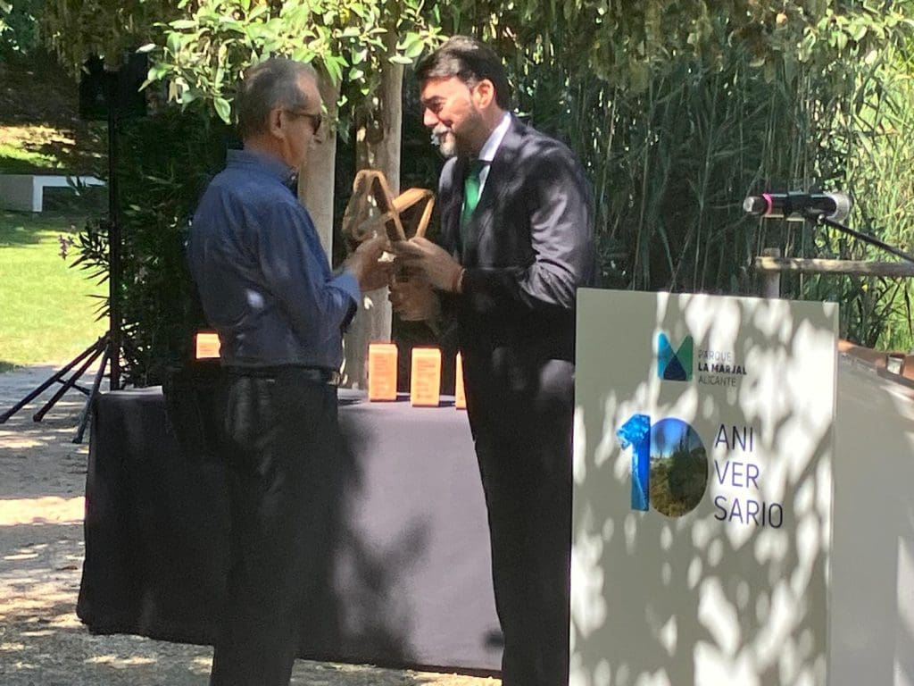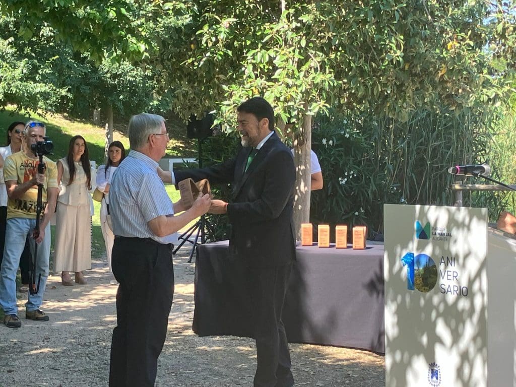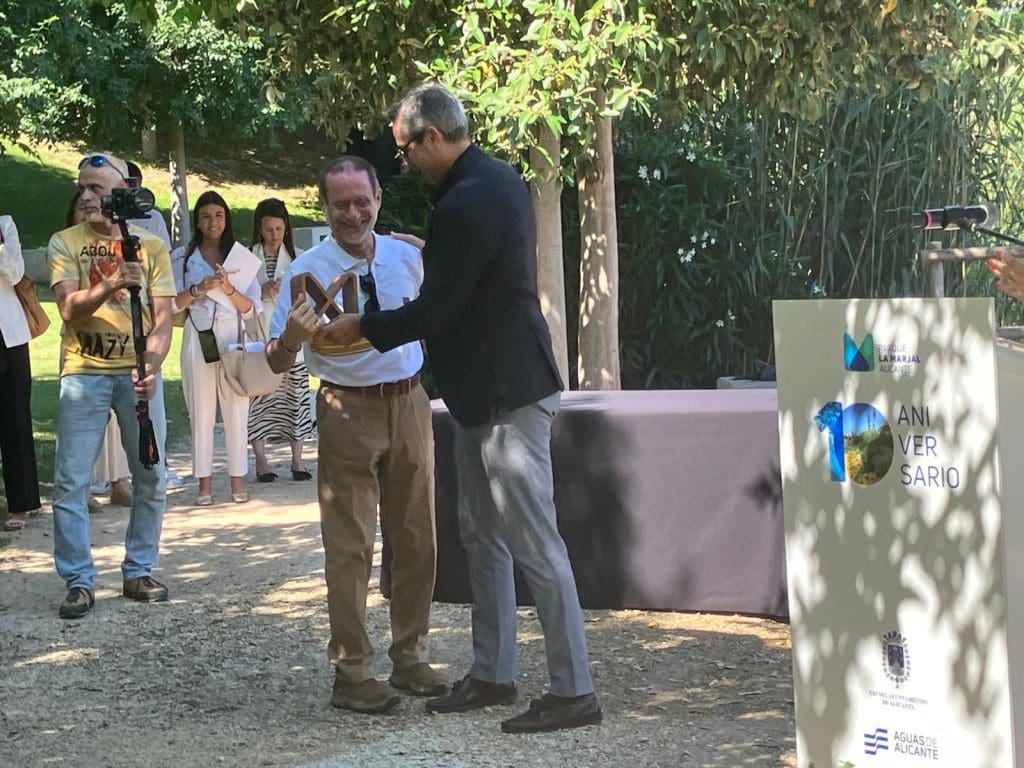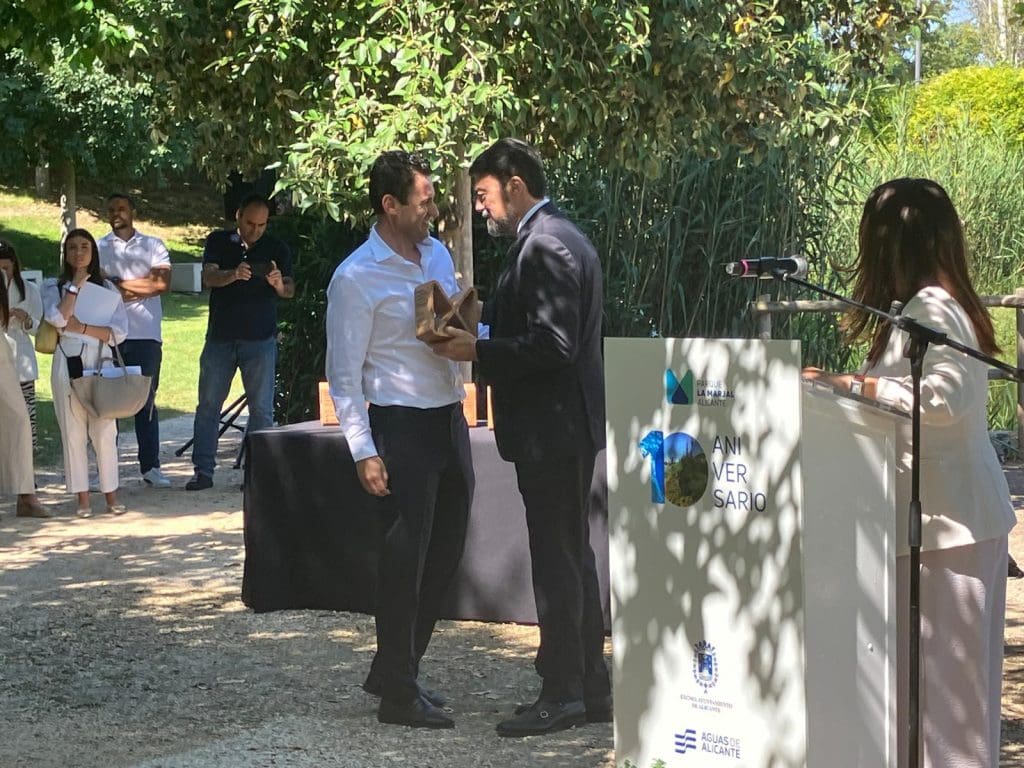 Ayuntamiento y Aguas han hecho entrega de un obsequio conmemorativo a los 10 técnicos que hicieron posible el Parque de La Marjal. Para el presidente de Aguas de Alicante, Sergio Sánchez, se trata de un ejemplo de «colaboración multidisciplinar», que se ha querido poner de relieve en los actos del décimo aniversario de su construcción.
