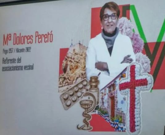 María Dolores Peretó ejerció como farmacéutica en la plaza de San Cristóbal. Presidió, durante varios años, la Asociación de Vecinos del Casco Antiguo y la de las Fiestas Tradicionales de San Roque. Recibió en 2021 el premio ‘Fester d´Alacant’ en la modalidad individual de Fiestas Tradicionales. También fue objeto de un reconocimiento en la exposición ‘12 mujeres emblemáticas de la ciudad de Alicante’, que se pudo ver entre diciembre de 2022 y enero de 2023 en el edificio municipal de Puerta Ferrisa.