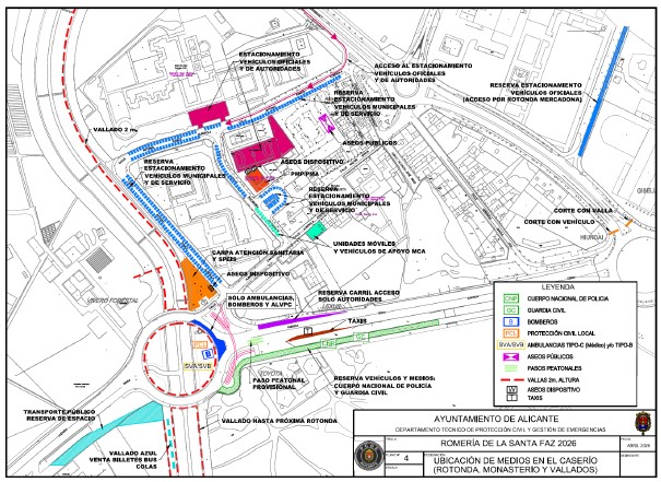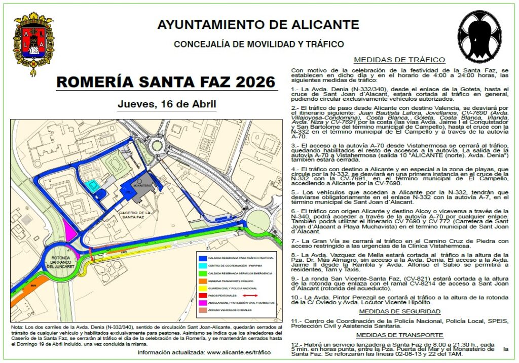 La celebración de Santa Faz implicará también un amplio dispositivo especial de tráfico. Durante el jueves, entre las 4.00 y las 24.00 horas, se activarán desvíos y restricciones por el cierre al tráfico del itinerario de la peregrinación en la avenida de Dénia. Los cortes afectarán a puntos como Vázquez de Mella, Gran Vía y Vía Parque, con desvíos por el frente litoral hacia las playas a través de la avenida de Villajoyosa y hacia la A-70.