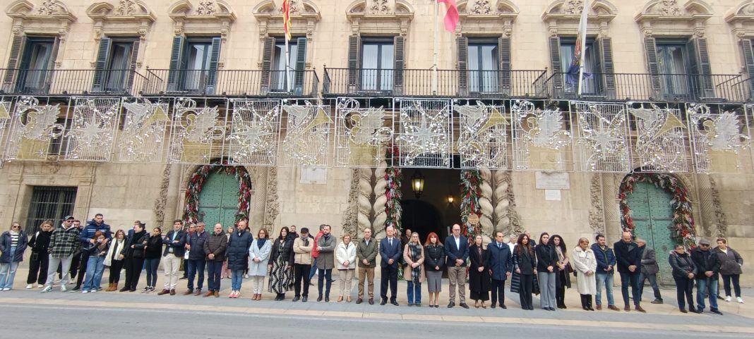 El Ayuntamiento de Alicante ha guardado este jueves tres minutos de silencio a las puertas de la Casa Consistorial en repulsa por el asesinato machista de Oriana, la joven de 29 años que fue asesinada el martes en Carolinas Altas.