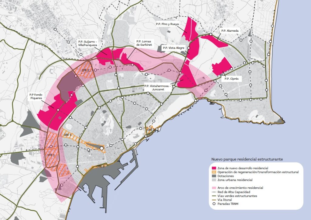El futuro Plan General Estructural de Alicante dibuja una oferta residencial de gran alcance para las próximas dos décadas. El documento en el que trabaja el Ayuntamiento contempla 22.300 viviendas en zonas de nuevo desarrollo, a las que se añaden 14.300 previstas en operaciones de regeneración urbana y reconversión de suelo industrial, 5.000 más en la ciudad consolidada y otras 1.300 dotacionales destinadas a alquiler asequible. En conjunto, la planificación supera las 40.000 viviendas.