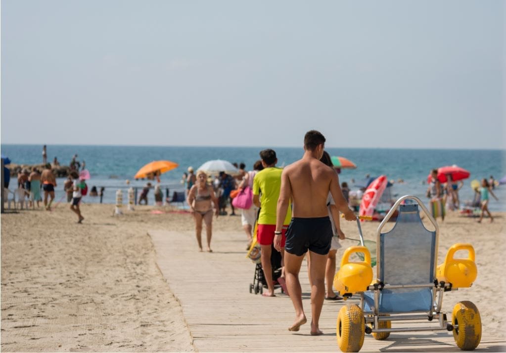 El servicio de playas accesibles, con baño adaptado para personas con movilidad reducida y áreas lúdico-pedagógicas para personas con diversidad funcional, arranca este sábado 1 de julio en las playas de San Juan y Urbanova y a partir del lunes estará operativo en el Postiguet y Tabarca.