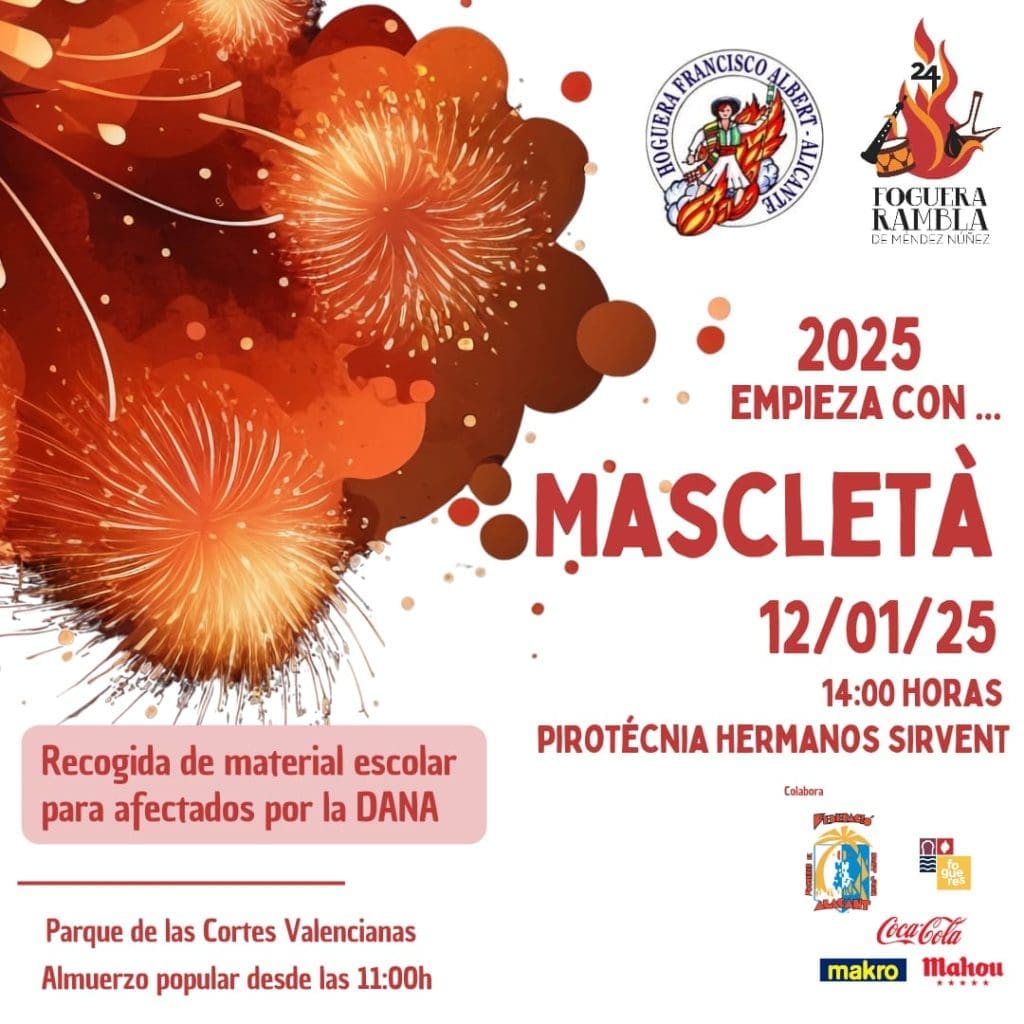 Previo al disparo de la mascletà, ambas hogueras realizarán un almuerzo popular que comenzará a las 11:00 horas y en el que se recogerá material escolar para los centros educativos afectados por la DANA del pasado otoño.