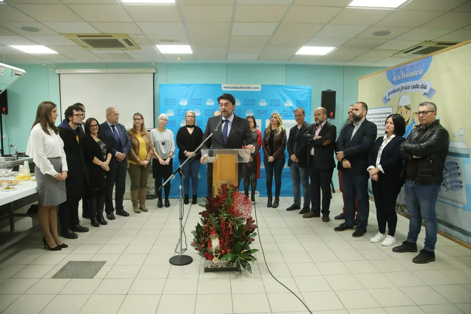 El alcalde de Alicante, Luis Barcala, ha asistido hoy al tradicional brindis de Navidad organizado por la Asociación de Comerciantes de Mercados Municipales, junto con su presidente, José Vicente Valenzuela, la concejala de Comercio, Marisa Gayo, y otros miembros del equipo de gobierno y la corporación municipal.