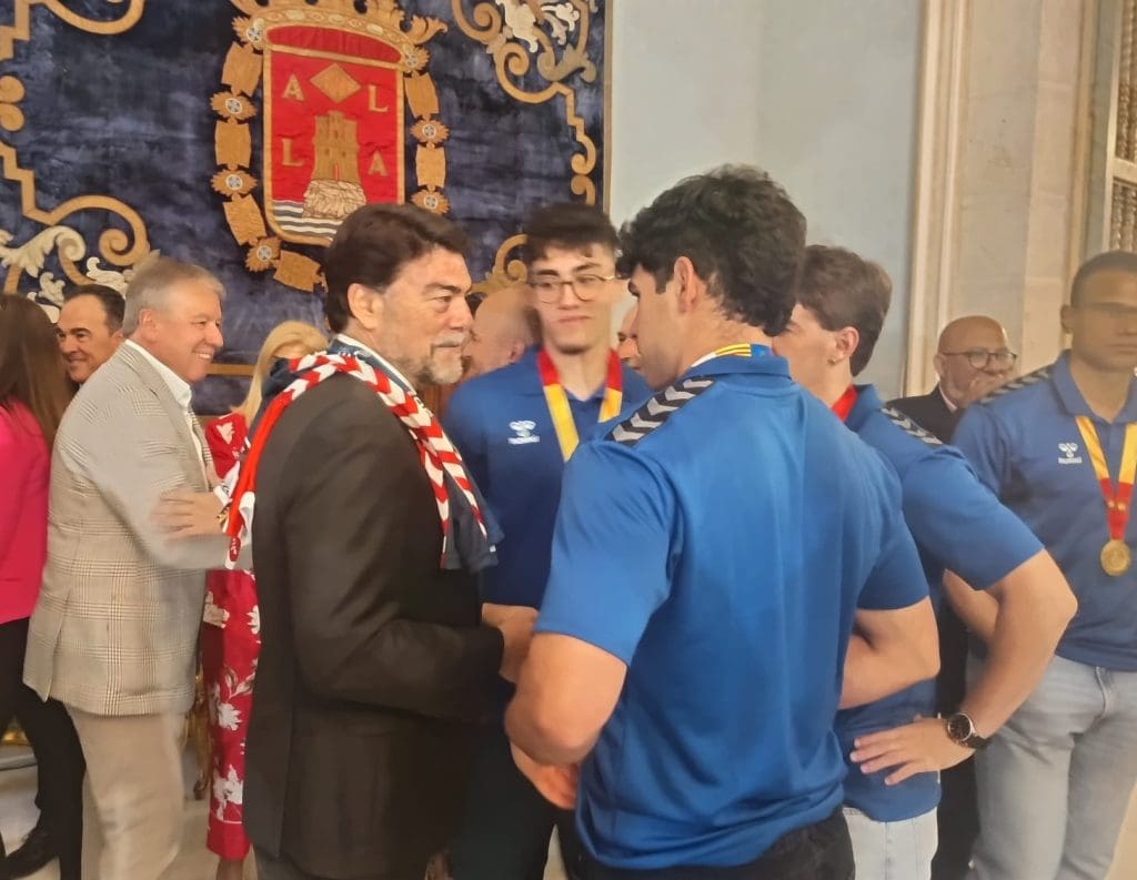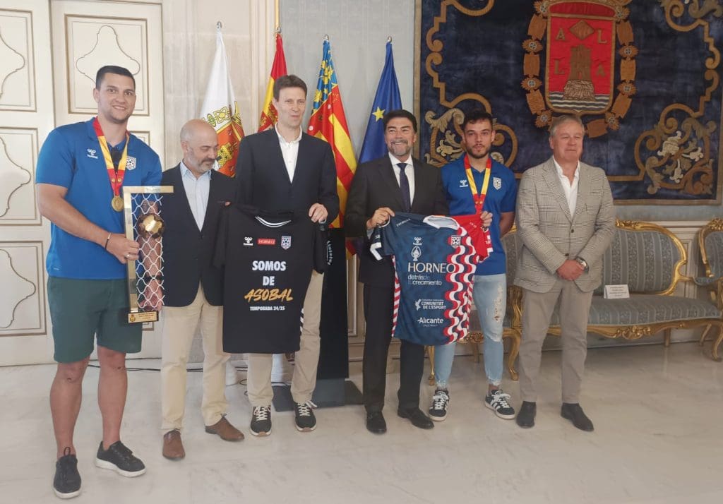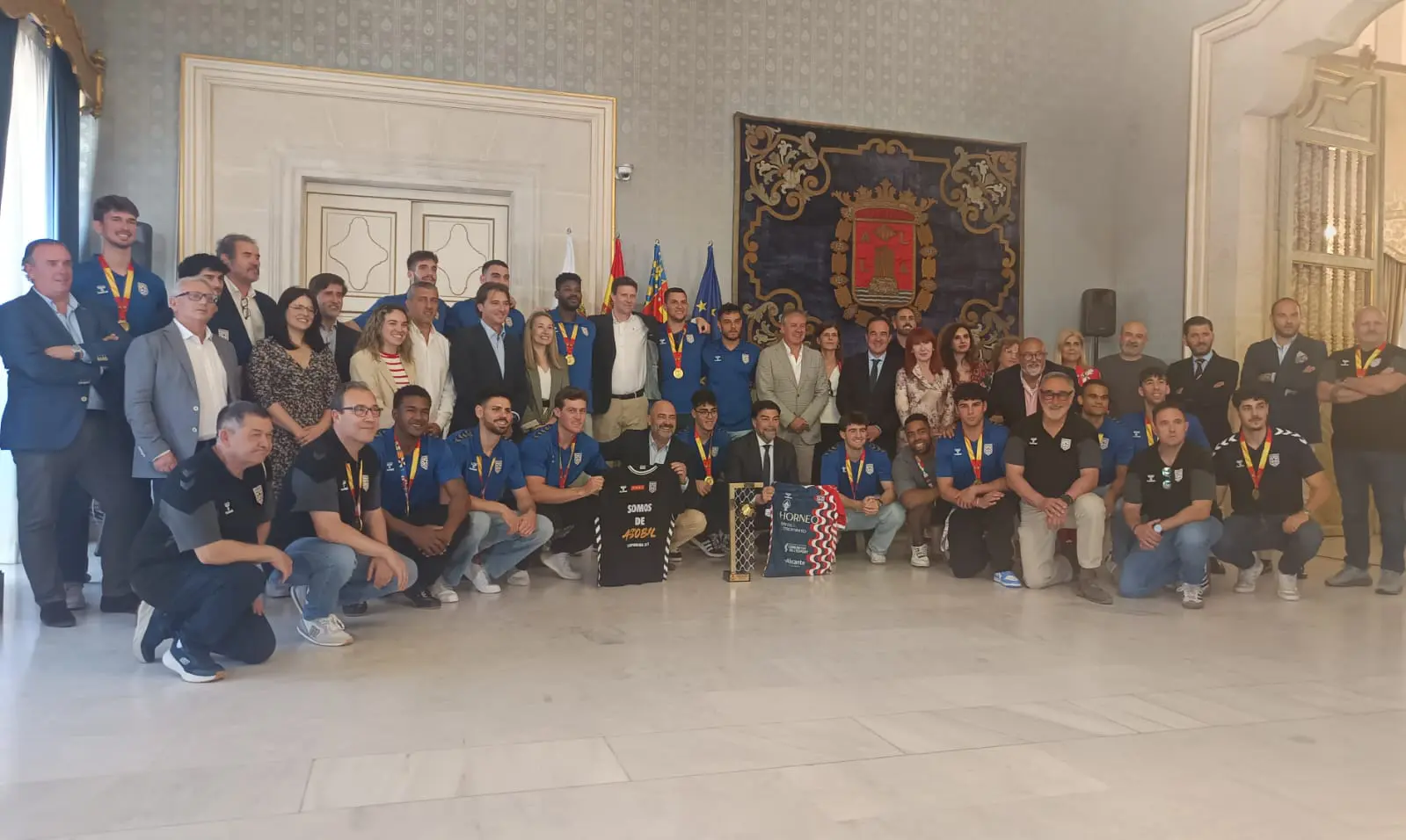 El alcalde Luis Barcala, junto al concejal de Deportes, Toni Gallego, e integrantes de la Corporación Municipal han recibido este martes en el Salón Azul del Ayuntamiento a la plantilla y directiva del Horneo Eón Alicante, equipo que el pasado sábado logró en Burgos el ascenso a la Liga Asobal. «Habéis hecho un regalo impagable a la ciudad que sirve para proyectarla y promocionarla. Todavía no sois conscientes de la importancia del logro conseguido. Ahora son momentos de lógica euforia. Pero, según discurra la competición, iréis reconociendo el valor de la gesta». Al referirse a los equipos de base del club, ha sostenido que «sois para ellos un referente, mucho más que un equipo por los valores que atesoráis y que habéis demostrado en la pasada campaña».