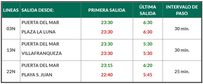 El servicio especial nocturno del autobús funcionará entre las 23.00 y las 06.30 horas, con salidas cada 30 minutos, mientras que el TRAM extenderá su servicio hasta las 03.00 horas para facilitar los desplazamientos y reducir el uso del vehículo privado.