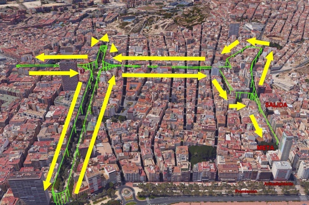 En este sentido informar que concretamente, el itinerario del evento, que estará cortado para que trascurra la prueba deportiva bajo control y supervisión de la Policía Local, desde las 18:00 y hasta las 20:30 horas aproximadamente, va a transcurrir por las siguientes vías: Rambla Méndez Núñez, a la altura de Casa de la Festa, calle San Vicente, Juan de Herrera, Calderón de la Barca, avendia Alfonso El Sabio, Plaza de los Luceros, avenida de la Estación, giró de 180° antes de calle Serrano), sin afectar a la misma, avenida Estación, Plaza de los Luceros, avenidas Federico Soto y Doctor Gadea, giro de 180° antes de Ramón y Cajal, sin afectar a ellas, avenida Doctor Gadea, avenida Federico Soto, Plaza de los Luceros, avenida Alfonso El Sabio, López Torregrosa y Rambla de Méndez Núñez con meta en la misma. El cierre Prohibición de estacionamiento y señalización en la Rambla Méndez Núñez desde las 14:00 horas y del resto a partir de las 18:00 horas.