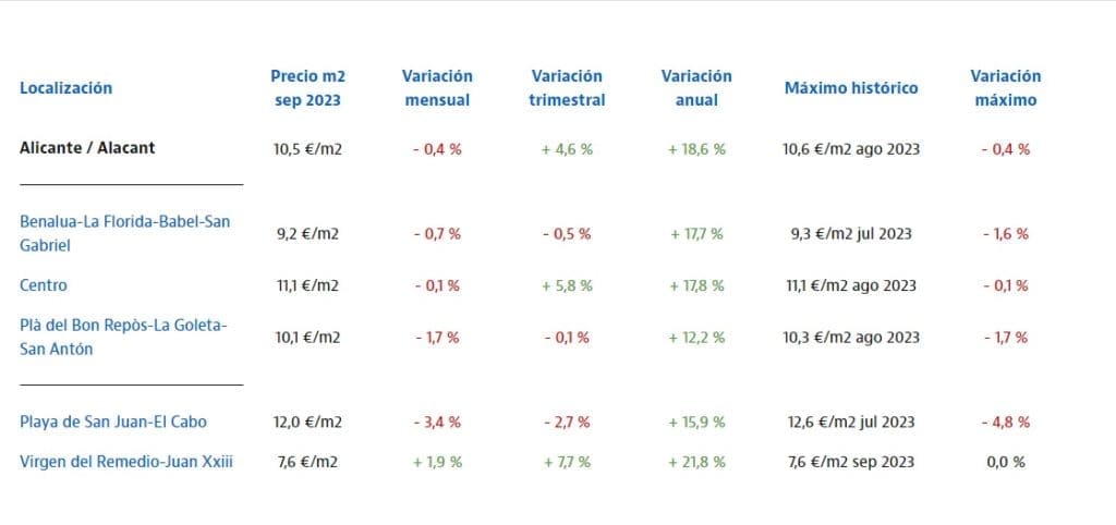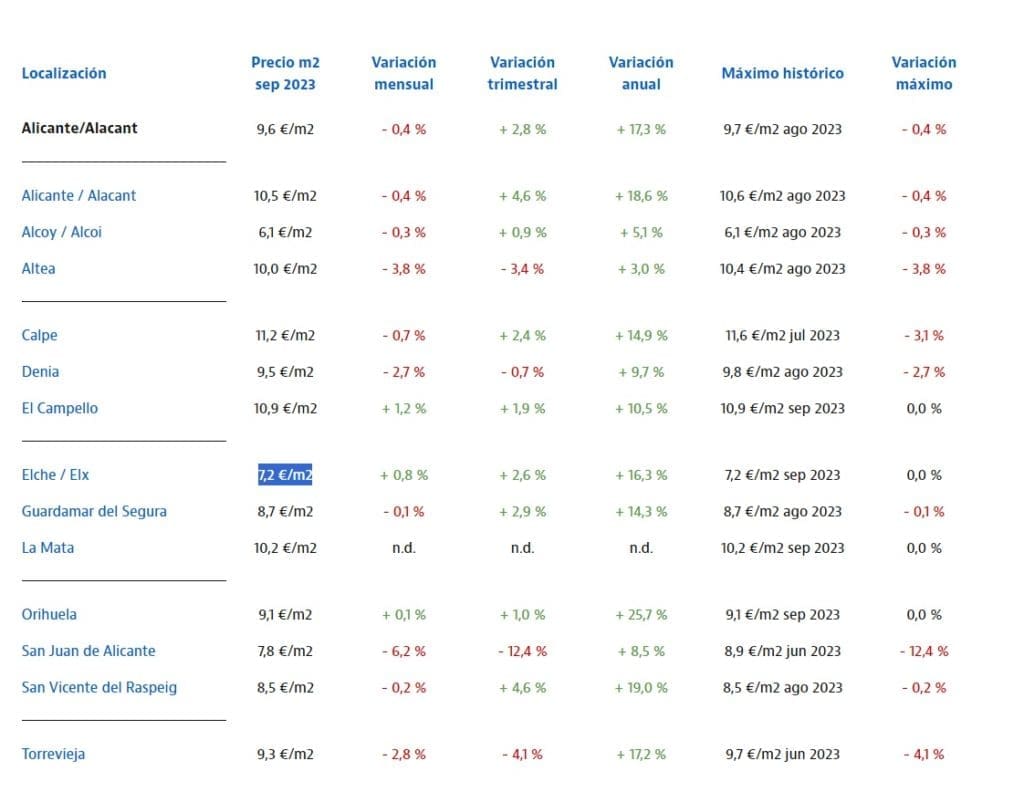 En estos momentos, de las localidades que analiza Idealista son Calp (11,2 €/m2), El Campello (10,9 €/m2) y Alicante (10,5 €/m2) los tres lugares más caros donde alquilar piso. Por contra, en Sant Joan d’Alacant, es donde más han descendido estos precios, un 12,4%. Y el precio por metro cuadrado se sitúa en 7,7 euros. Elche, la segunda ciudad más poblada de la provincia sitúa las rentas en septiembre en 7,2 €/m2, con una variación trimestral de 2,6% y anual de 16,3%. Desde junio a septiembre, los anteriores municipios han registrado precios máximos históricos.