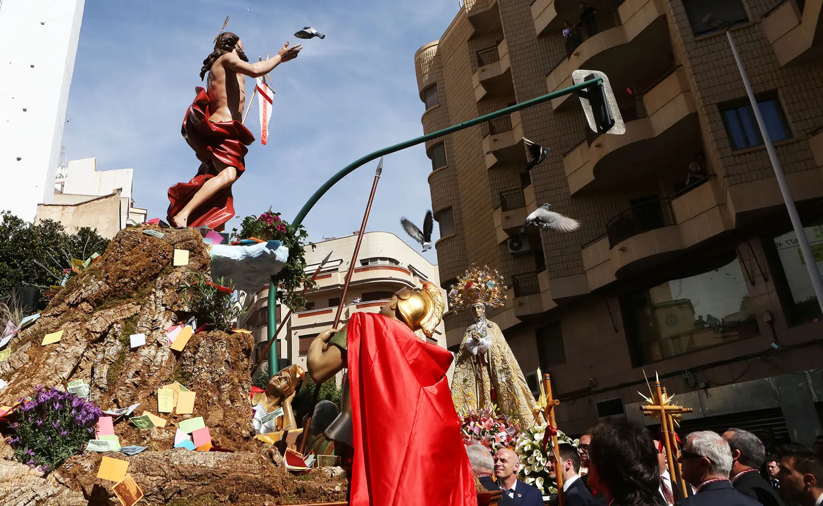 El desfile procesional del Domingo de Resurrección continuó hasta la plaza de Baix donde, por primera vez, el Resucitado dio la vuelta para recibir de cara a la Virgen, entre millones de aleluyas, estampas con motivos de la Semana Santa, lanzadas desde el Ayuntamiento y de los edificios de la zona. Tanto en esta plaza como en Reina Victoria y calle Corredora el manto de aleluyas ofreció un singular y sorprendente espectáculo. La procesión contó con la presencia del alcalde, Carlos González, miembros del equipo de Gobierno y de la Corporación Municipal, además de distintas autoridades civiles y religiosas. González ha valorado tanto la multitudinaria participación como el esfuerzo que realizan durante todo el año numerosos ilicitanos para mantener vivas sus tradiciones y señas de identidad.