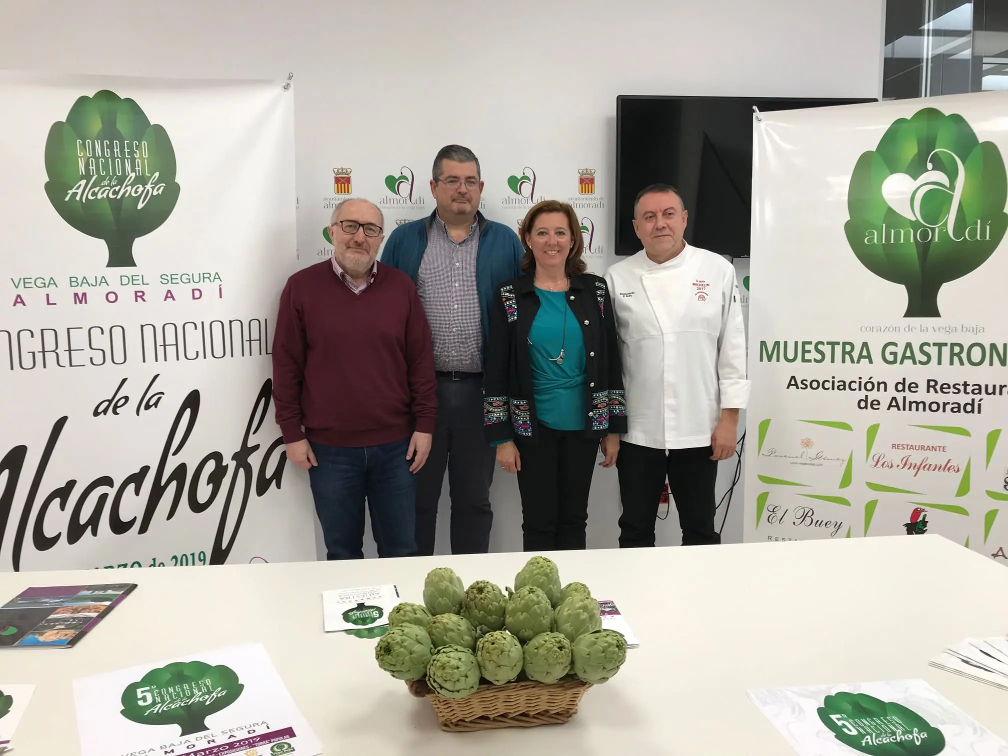 El V Congreso de la Alcachofa, organizado por el Ayuntamiento de Almoradí, que tendrá lugar el próximo fin de semana, 9 y 10 de marzo, ha sido presentado esta mañana por la alcaldesa de la localidad, María Gómez, el concejal de Fomento y Turismo, José Antonio Latorre, el presidente de la Asociación Alcachofa Vega Baja, Diego Martínez, y el chef Moisés Martínez, representante de la Asociación de Restaurantes de Almoradí.