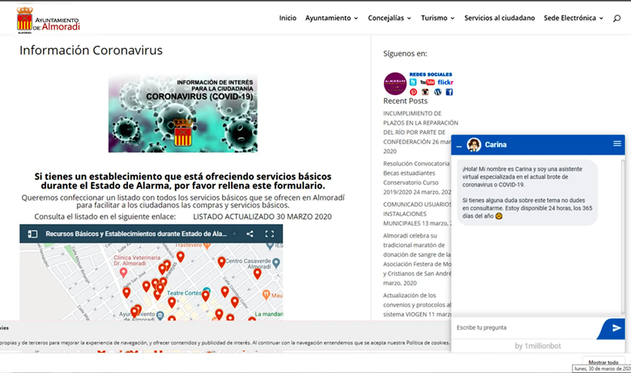 En la misma página se ha instalado el sistema de asistente virtual llamado «Chat Bot Carina», que resuelve dudas sobre el Coronavirus y está operativo las 24 horas del día de forma gratuita.