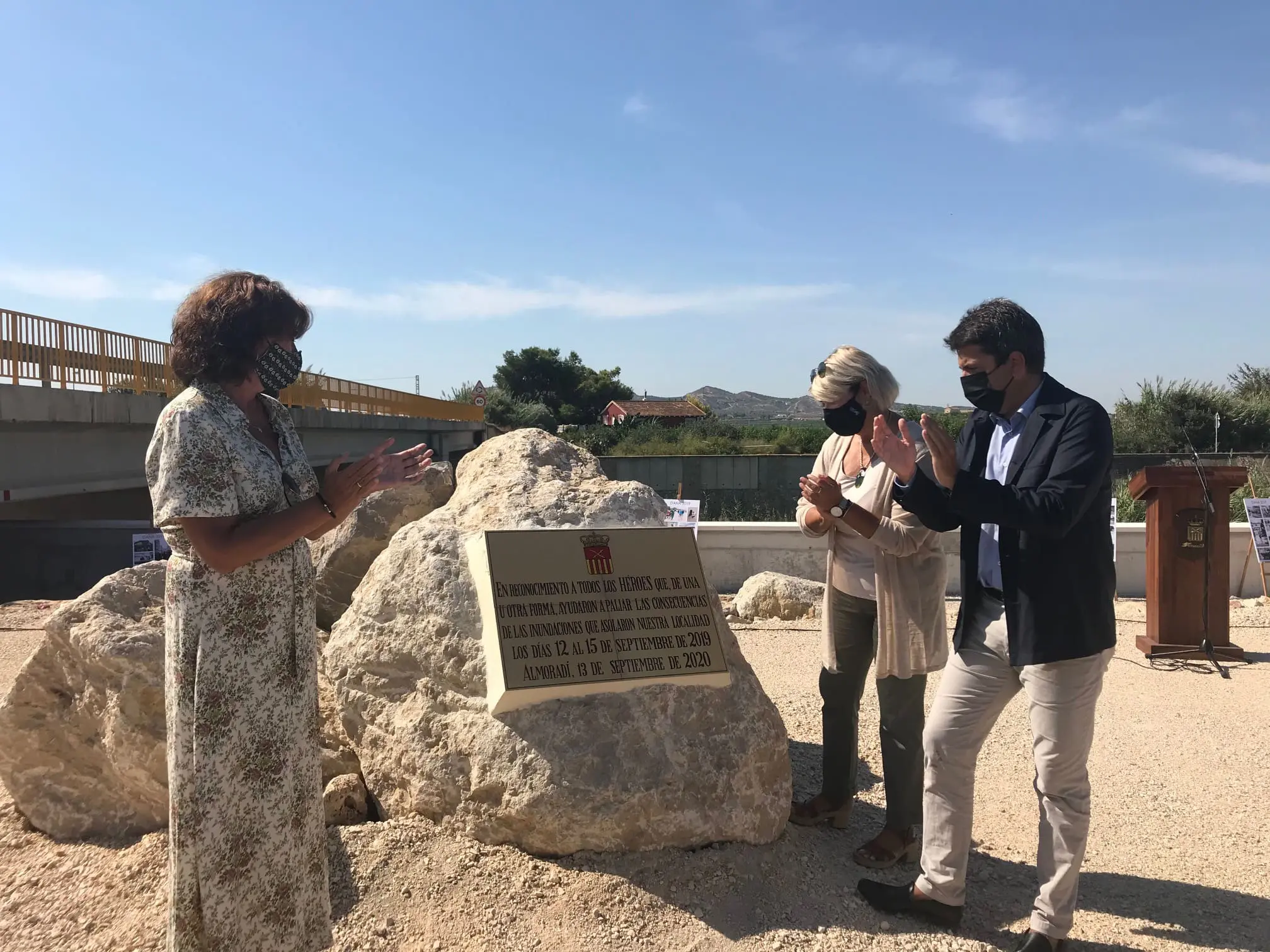 La alcaldesa, María Gómez, acompañada de Carlos Mazón, presidente de la Diputación Provincial de Alicante, de Antonia Moreno, directora territorial de Presidencia, así como de diputados provinciales y autonómicos, la presidenta del PP autonómico, Isabel Bonig, concejales y representantes de la UME, de Guardia Civil, Cruz Roja, Bomberos, Policía Local, Protección Civil y de distintos tejidos sociales y comerciales de la localidad, han visto como se quedará para siempre en este lugar el recuerdo y agradecimiento a todas las personas anónimas que se unieron para hacer resurgir la localidad de esta catástrofe, se ha colocado así una placa justo en el punto de la brecha que derivó en una inundación sin precedentes, que ya forma parte de la historia tras su reparación definitiva.