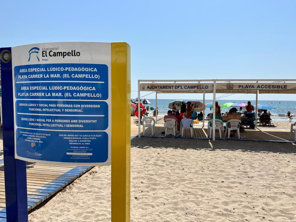 Especialmente pensada para personas con algún tipo de diversidad intelectual, sensorial y física, atendida por profesionales y durante dos meses completos (julio y agosto), desde las 10:30 hasta las 17:30 horas, y de lunes a sábado. El área especial lúdico-pedagógica de la playa Carrer la Mar de El Campello se ha convertido en un ejemplo de convivencia, empatía e inclusión, que este año ha alcanzado los 250 usuarios, frente a los 160 del verano pasado.
