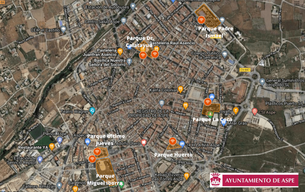 El Ayuntamiento de Aspe ha puesto en marcha la instalación de una red inalámbrica (wifi) que proporciona conexión gratuita a internet para los visitantes de los parques: Miguel Iborra, Último Jueves, Huerto, La Coca, Dr. Calatayud y Padre Ismael.