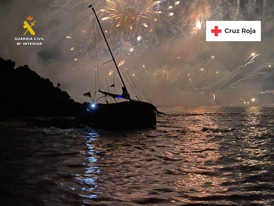 El mismo día 12, a las 23:40 horas, minutos antes del espectáculo pirotécnico, los componentes del Servicio Marítimo fueron avisados por la Central Operativa de Servicios (COS) de la Guardia Civil de Alicante, informando sobre el avistamiento de un velero encallado en la Isla de l’Olla. Recibido el aviso, los componentes del Servicio Marítimo, se aproximaron en la embarcación auxiliar al velero, observando a una persona en el agua y a merced de las olas, intentando liberar el velero. Finalmente, los agentes, con la ayuda de la embarcación de Cruz Roja, consiguieron auxiliar al individuo y salir de la zona de rocas, pudiendo trasladarlo a la embarcación Rio Oja y posteriormente a la zona habilitada del Puerto de Campomanes, donde fue auxiliado por personal del 112.
