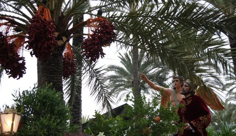 El trono del paso de la Cofradía de la Oración del Huerto representa un huerto típico ilicitano, en el que figuran un olivo, un granado (árbol frutal), un naranjo, un limonero y, como elemento central, la palmera, donde cada año se colocan los estorninos en un arnés junto a las hojas.