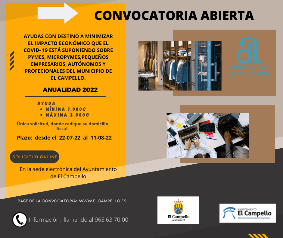 La Concejalía de Fomento Económico y Comercio del Ayuntamiento de El Campello, dirigida por Marisa Navarro, ha publicado la convocatoria de las ayudas de la Diputación de Alicante para la anualidad 2022, cuyo objetivo es minimizar el impacto económico que el COVID-19 está suponiendo sobre pymes, micropymes, autónomos y otros colectivos sujetos a mutualidades.