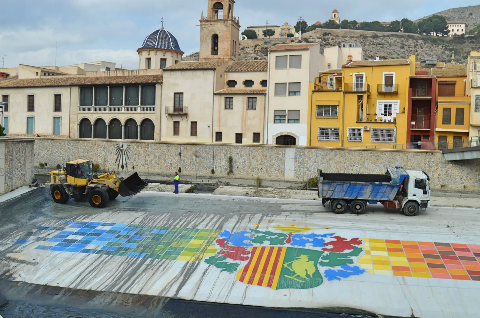 Estos trabajos fueron llevados a cabo para la eliminación de lodos en el cauce por la Confederación Hidrográfica del Segura (CHS), dañando la pintura del azud que fue realizada la pasada primavera con el nuevo diseño del escudo de la ciudad que se ha convertido ya en la imagen promocional de la misma.