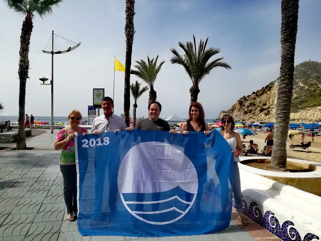 La Bandera Azul concedida este año a la Cala de Finestrat por su excelencia, tanto en calidad de las aguas como en servicios, ya ondea en la playa. En su izado participó esta mañana el alcalde, Juan Francisco Pérez, junto a la concejala de Playa, Amelia Mayor, el edil de Medio Ambiente, Tomás Sellés y las concejalas Mª Dolores Viudes y María Llorca.