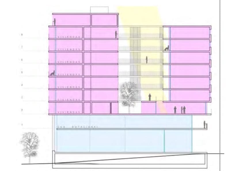 En este proyecto intergeneracional las viviendas se ubicarán entre la segunda y la octava planta y cada una de las alturas cuenta con una zona de 31 metros cuadrados para usos comunitarios como lavandería, gimnasio, lectura o invernadero. En segunda planta también se habilitarán dos salas, de 113 m2 totales, destinadas al desarrollo de actividades comunitarias, un patio ajardinado y aseos. Y en la planta de cubiertas se ubica una terraza solárium con una zona de 96m2 protegida del sol.