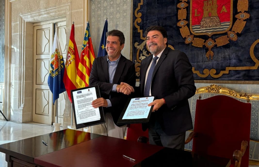El alcalde de Alicante, Luis Barcala, y el presidente de la Generalitat, Carlos Mazón, han firmado este viernes un convenio de colaboración con la Fundación Comunitat Valenciana-Región Europea para reforzar la participación de la capital de la provincia y en la construcción europea mediante la promoción de los intereses municipales en el ámbito europeo.