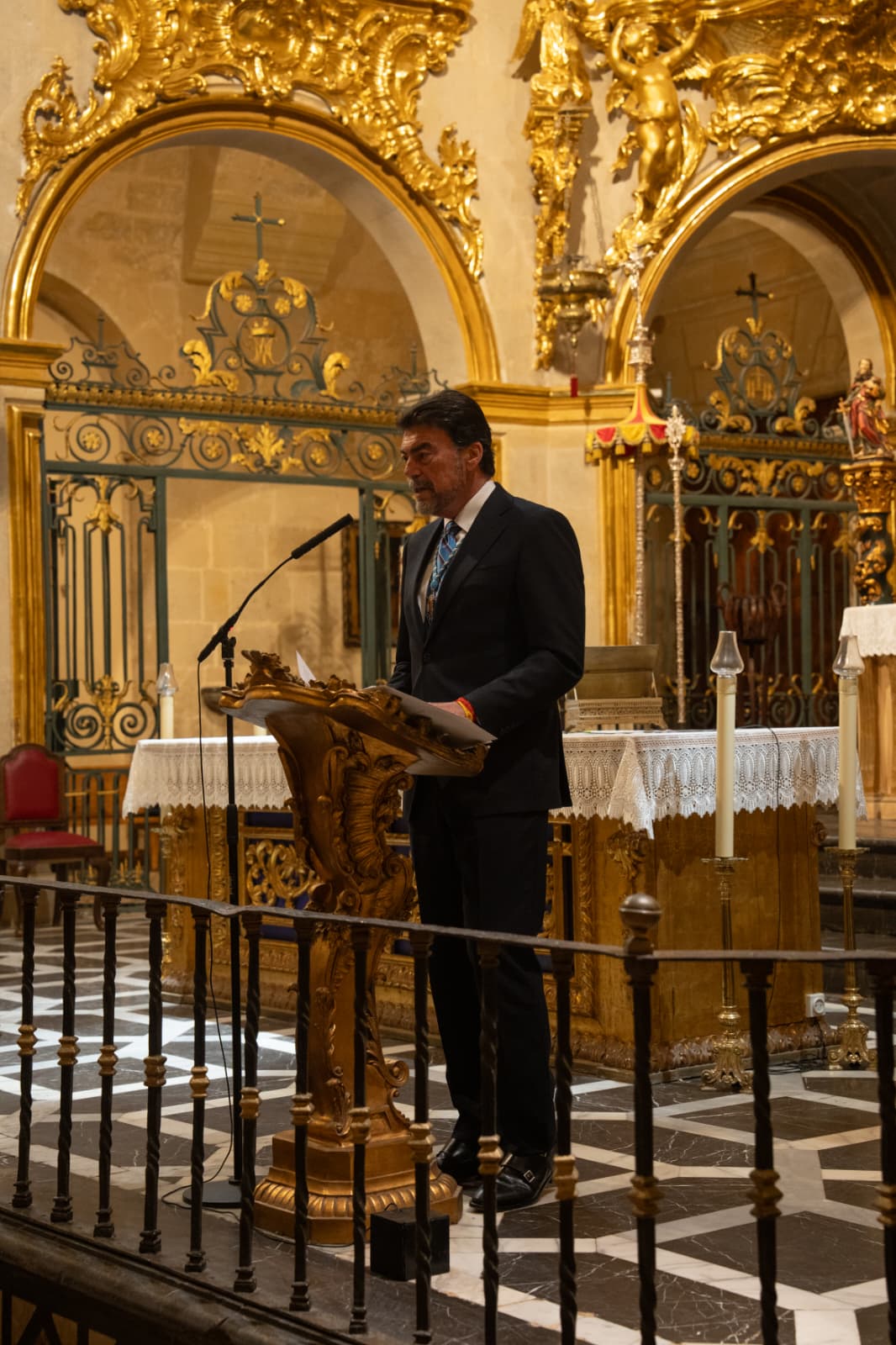 El alcalde de Alicante, Luis Barcala, ha pronunciado este viernes en la basílica de Santa María el pregón en el Acto Institucional de las hermandades del Cristo del Mar, Nuestra Señora de los Dolores Coronada y San Juan de la Palma, Jesús en Samaria, Santa Oración en el Huerto y Virgen de la Paz, Cristo de las Penas y Santa Mujer Verónica.