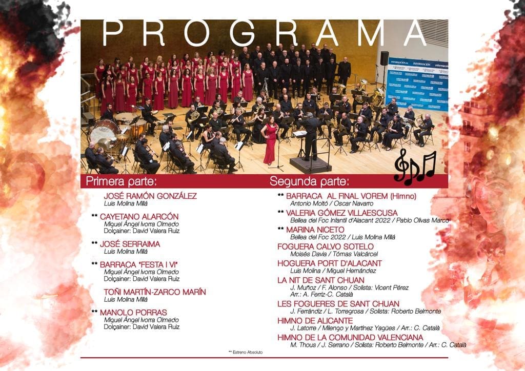 La primera pieza en sonar anoche fue «José Ramón González«, de Luis Molina. También se pudieron escuchar las piezas en homenaje a Cayetano Alarcón , José Serrama, la actual presidenta de la Federació, Toñi Martín-Zarco, y Manolo Porras. Además en el repertorio sonaron las melodías dedicadas a las barracas «Festa i Vi» y «Al final vorem» además de las hogueras Calvo Sotelo y Port d’Alacant.